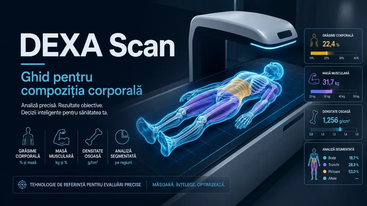DEXA scan măsoară masa musculară, grăsimea viscerală și densitatea osoasă. Ghid pentru cine, când și cum interpretezi un raport.